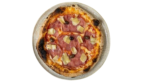 (Tomato sauce, cheese, ham, artichoke, olives)