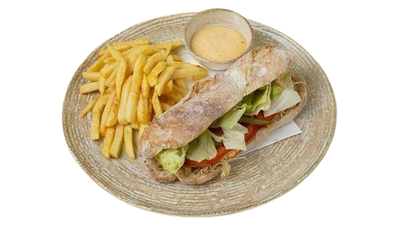 Chicken, tomato, pickled cucumber, green salad, French fries